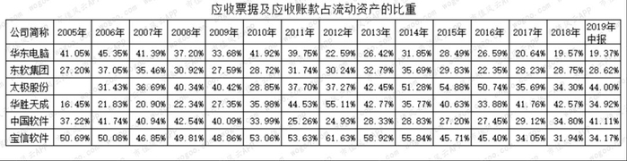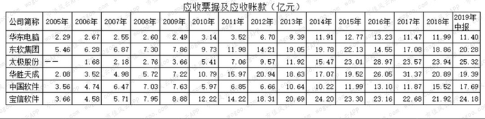 应收账款是宝信软件的突出问题,2018年其年营业收入刚突破50亿元,达54亿元,但是其应收账款金额及所占流动资产比重均超过营收规模70亿元以上的华东电脑和东软集团。
