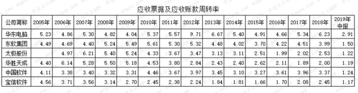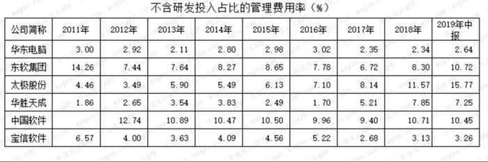 207年以来,宝信软件的期间费用率出现下降趋势,2019年中报为14%,仅高于11%的华东电脑。