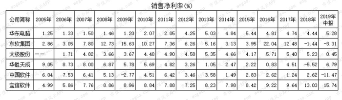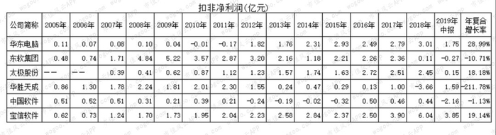 从2005-2018年复合增长率看,东软集团与华胜天成的均为负值,两家公司在2018年均亏损;太极股份与华东电脑的年复合增长率接近;宝信软件排第三,中国软件年复合增长率较低。