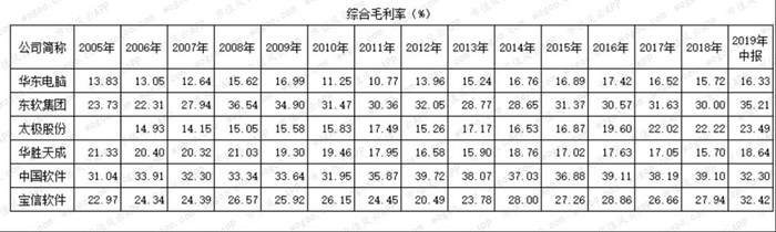 比较有趣的是,太极股份、华胜天成、华东电脑的综合毛利率水平虽然比较低,但是它们除少数年份出现异常外,长期保持相对较稳定水平;中国软件的毛利率虽长期高于另外5家公司,但其在2018年出现明显下滑,并且低于东软集团和宝信软件,而后两家公司也是6家公司中唯二出现综合毛利率稳中有升的。
