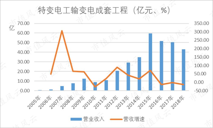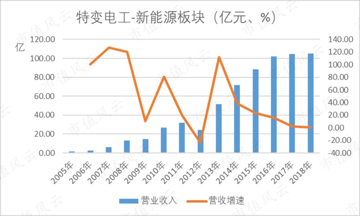依托在输变电产品及工程业务上积累的经验,以及行业增长带来的红利,上市公司的新能源板块也经历了一段快速增长期,集中在2005-2016年期间,并成为第一大收入来源。