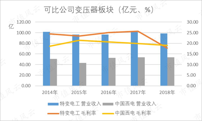 而毛利率的大幅下滑,导致特变电工变压器板块持续多年的毛利率优势终在2018年被中国西电反超。