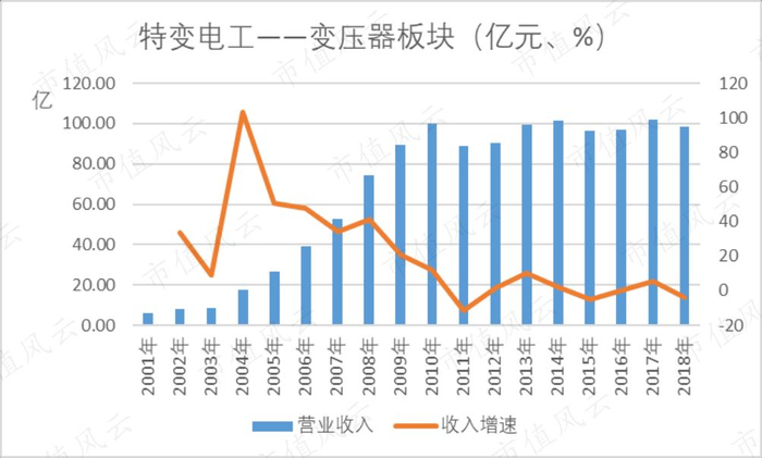 2001-2010年期间,是特变电工的变压器板块的快速扩张期,由2001年的5.91亿元增长至100.16亿元,复合增长率高达36.96%。