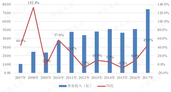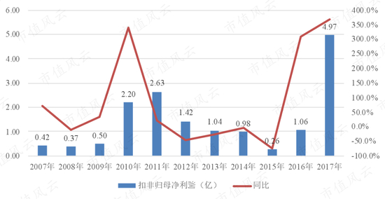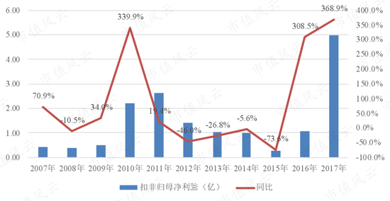 不过没想到2017年业绩大涨:营业收入实现74.12亿,同比增长45.3%;扣非归母净利润实现4.97亿,同比增长368.9%。
