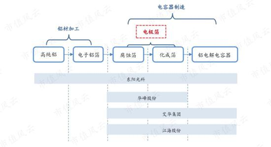 东阳光拥有“高纯铝-电子铝箔-电极箔(包含腐蚀箔和化成箔)-铝电解电容器”全产业链,核心产品为中高压电极箔。