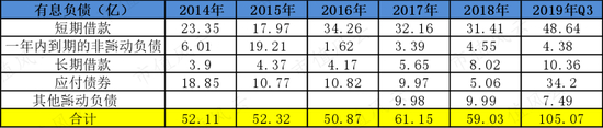 有息负债高企,短期借款很高,2019年第三季度应付债券增加主要是发行了4亿美元的可转债。