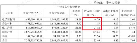 电子新材料因为出口、化工行业因为周期波动的原因收入都有所下滑,特别是化工产品毛利率下降很明显,和2017年完全是反过来。