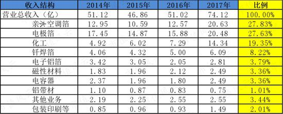 从收入结构可以看出,收入主要是亲水空调箔、电极箔和化工产品占比最高。