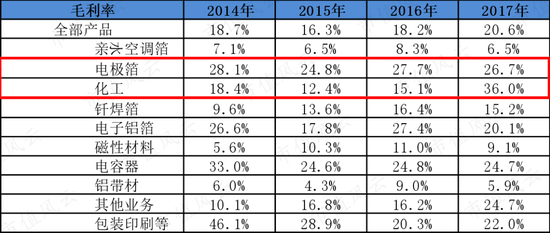 但毛利率而言,主要是电极箔和化工产品的毛利率高一些,特别是2017年化工产品毛利率提升比较明显。