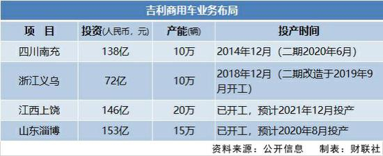 据财联社记者统计,上述四大吉利商用车基地(南充、义乌、上饶和淄博)总投资达509亿元,总产能55万辆。