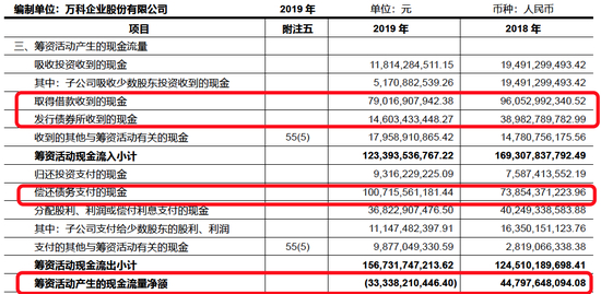 在融资端和偿债端“此消彼长”之间,万科2019年筹资活动产生的现金流净额为-333.38亿,是自2016年楼市实行新一轮调控以来首次为负值。