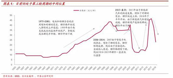 从 1975 年至今,锂价基本经历了三轮大周期:第一轮周期(1975-2001 年)电池和铝锂合金的工业化需求引领锂进入上行周期,低成本盐湖的投产导致锂价下滑;第二轮周期(2006-2014 年)3C 电子产品引领下,锂进入上行周期;第三轮周期(2015 年-至今)新能源汽车爆发引领锂价进入上行周期,2018年随着新能源汽车增速放缓,锂价开始下滑,目前仍处于第三轮周期的中间位 或者末尾。