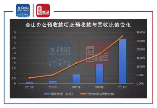 图2:2015-2019年金山办公预收款项及预收款项与营收比值变化