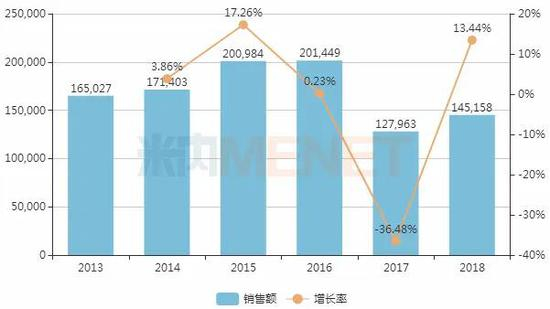 图1:2013-2018年中国公立医疗机构终端血必净注射液销售情况(单位:万元)