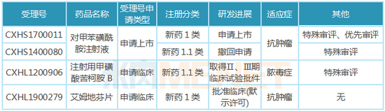 红日药业首次提交对甲苯磺酰胺注射液(适应症:中央型非小细胞肺癌伴严重气道阻塞)上市申请于2014年5月获得CDE承办受理,但在2015年的“722”临床数据自查中主动撤回。之后,红日药业二度提交该产品上市申请并于2018年1月获得CDE承办受理,同年3月以“具有明显治疗优势创新药”为由纳入优先审评,目前还处于“在审评审批中”状态。米内网数据显示,对甲苯磺酰胺注射液在晚期肝癌、早期乳腺癌、头颈部鳞癌等多个适应症的II期临床均已完成。