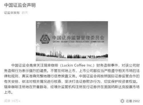 昨日,“证监会发布”微信公众号发布声明称:“中国证监会高度关注瑞幸咖啡(Luckin Coffee Inc.)财务造假事件,对该公司财务造假行为表示强烈的谴责。不管在何地上市,上市公司都应当严格遵守相关市场的法律和规则,真实准确完整地履行信息披露义务。中国证监会将按照国际证券监管合作的有关安排,依法对相关情况进行核查,坚决打击证券欺诈行为,切实保护投资者权益。瑞幸咖啡注册地在开曼群岛,经境外监管机构注册发行证券并在美国纳斯达克股票市场上市。”