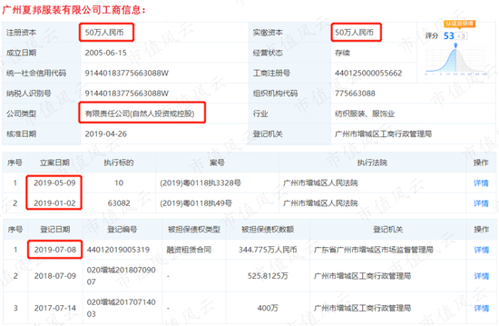 与动辄千万甚至上亿的交易规模形成鲜明对比的是,夏邦服装的注册资本只有50万元,其关联方的注册资本也只有1000万元(未缴足)。且夏邦服装在2019年曾两度被法院列为被执行人,同年7月新增一笔资产抵押。