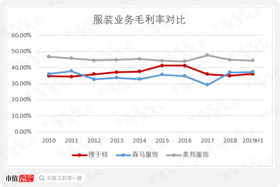 2018年公司服装业务毛利率被森马服饰反超,在与美邦服饰(002269.SZ)、森马服饰的比拼中居于末位。
