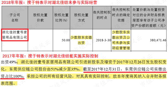 2018年,搜于特却不参与湖北佳纺的实际经营了,并因少数股东实缴出资搜于特对湖北佳纺不再并表。