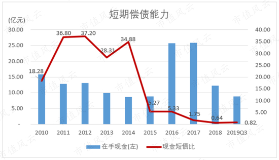 在此我们引入一个短期偿债能力指标——现金短债比,即在手现金与一年内到期的债务之比,这个指标越大表明短期偿还能力越强。