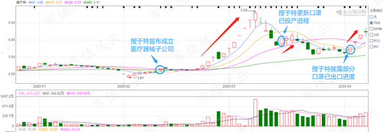 待市场情绪稍稍冷静后,搜于特分别在3月16日、4月2日更新披露口罩已投产、部分口罩逐步向国外出口的进展,在全球疫情进一步加剧的背景下为公司股价再“添把火”。