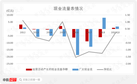 3、2019年前三季度的经营性净现金流和广义现金流好不容易同时为正,但净现比仅为0.22,远小于1,经营现金回流至公司的效率低。