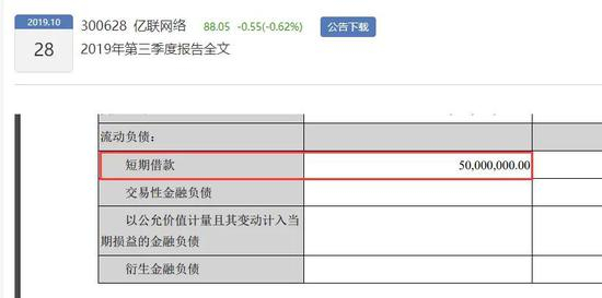 然而,《每日经济新闻》记者却发现,据亿联网络披露的2019年三季报,就是在截至2019年9月20日还有1.5亿元可“随时取用”的银行存款、超过25亿元自有闲置资金用来理财的情况下,公司却在报告期新增了5000万元的短期借款。此外,这笔5000万元的短期借款,并未出现在亿联网络2019年半年报里,而且在发布三季报前,公司也并未就这笔借款发布过相关公告。