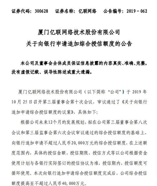记者还注意到,2019年10月28日,亿联网络还公告称,公司向银行追加申请了不超过人民币2亿元的综合授信额度,此次向银行追加申请综合授信额度完成后,公司综合授信额度提高至不超过人民币4亿元。