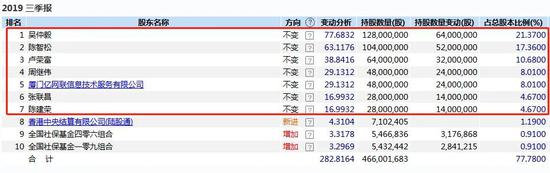另据Wind金融终端显示,自亿联网络2017年3月17日上市以来,公司已累计实现净利润24.25亿元,截至4月8日收盘已累计分红三次,累计现金分红近6亿元。但《每日经济新闻》记者注意到,根据亿联网络2019年三季报显示,公司实控人即吴仲毅、陈智松、周继伟、卢荣富,和厦门亿网联信息技术服务有限公司、张联昌(公司核心技术人员)以及陈建荣七名股东累计持股比例达到74.77%。