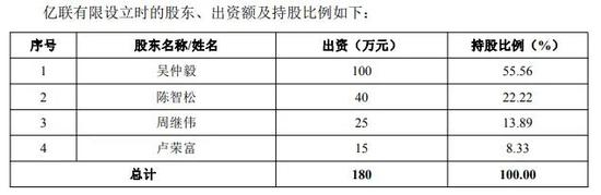 2001年10月29日,吴仲毅、陈智松、周继伟、卢荣富共出资180万元成立亿联网络技术有限公司(亿联网络前身,下称亿联有限),其中吴仲毅出资100万元,持股比例55.56%。