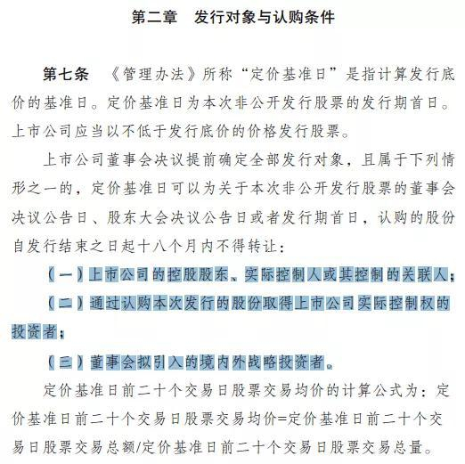 再复习下再融资新规(正式名称为《上市公司非公开发行股票实施细则》)第七条可以发现,向潜在控股股东发行股份,可以适用锁价定增,还可以绕开有关“战略投资者”的严苛认证,确定性很强。