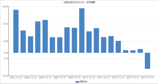 Wind数据显示,2014年至2019年,云南白药扣非后归母净利润分别实现22.67亿元、26.15亿元、27.00亿元、27.81亿元、29.18亿元和22.89亿元。其中,扣非净利润同比增速从2010年的57.59%一路下滑,2019年云南白药扣非净利润同比增速-20.80%更是刷新了该公司上市以来的纪录。