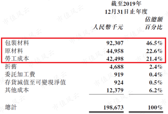 2019年公司营业成本里:46.5%是包装成本,原材料成本和劳工成本分别占比22.6% 、21.4%。