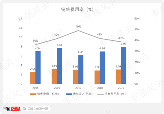 尽管金嗓子的毛利率一点也不低,但是Ta每年的销售费用很多,是占比最大的费用支出:2015-2019年,金嗓子的销售费用率保持在40%左右。