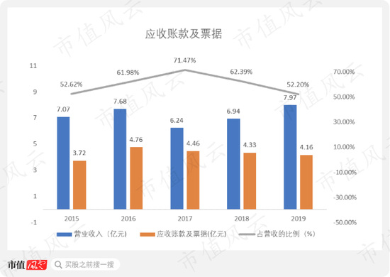 金嗓子每年都有非常多的应收账款及票据,数额在4个亿左右,其占营收的比例高达50%以上。