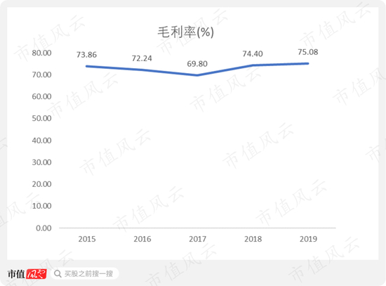 对比一看,金嗓子喉片的毛利率在2015-2019年一直保持在75%左右,而金嗓子喉宝的毛利率则在60%上下。