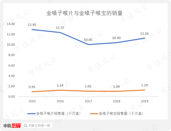 在2017年触底之后,喉片的销售量开始逐渐回升,在2019年达到1.13亿盒,不过这个销量仍然比2015、2016年的低。