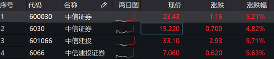 新浪财经讯 4月14日消息,下午2点后,有媒体报道称中信建投和中信证券欲合并,A股港股中信证券中信建投集体飙升。 中信建投AH股集体飙升10%,A股一度涨停。中信证券AH股涨5%。