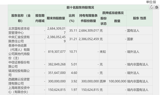 新浪财经查询发现,根据中信建投2019年年报,北京国资管理中心持股中信建投35.11%,为最大股东;中央汇金持股31.21%,为第二大股东;香港中央结算代持10.71%,持股8.19亿股;第四大股东为中信证券,持股为5.01%。不过,由于中信证券和镜湖投资为一致行动人,中信系合计持有公司9.61%的股权。