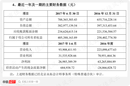 此外,净利润看起来似乎也不错:2017年上半年有近2700万元,按被收购时100%股权对应9.58亿元的估值,市盈率17.74倍,似乎不算高。