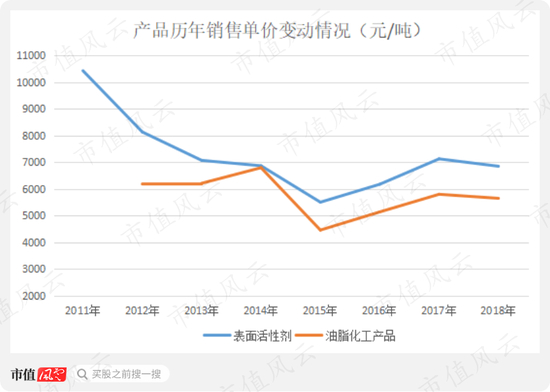 从上图可以清晰看出,自2011年以来,赞宇科技的两大产品经历了长达4年的下跌,直到2016年产品单价才有所回升。