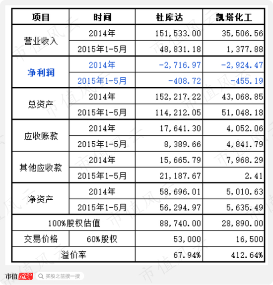 其二,凯塔化工的营业收入下降幅度非常大,2014年全年营业收入3.55亿元,然而,2015年1-5月份营业收入却不到1400万元;凯塔化工的溢价率比较高,净资产只有5635万,估值却溢价412%,达2.89亿元;