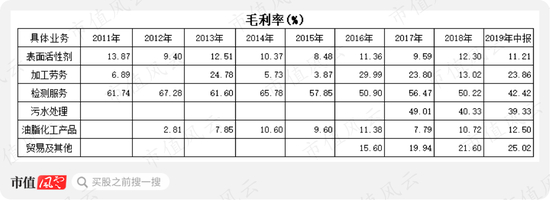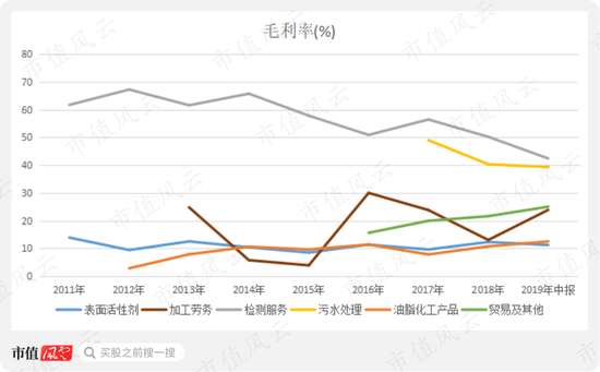 从上方图表看,表面活性剂业务毛利率整体变动不大,维持在11%上下水平,2015-2018年毛利率出现小幅提升;油脂化工产品的毛利率也呈现窄幅震荡态势,2017-2019年中报也出现小幅提升。