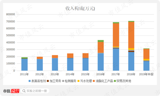 赞宇科技自2011年上市到2015年营收规模均没有发生大的变化,直到2016年、2017年先后收购凯塔化工和杜库达的控股权后,营收规模出现大幅增长,其中油脂化工业务收入增长最明显。