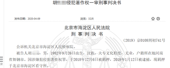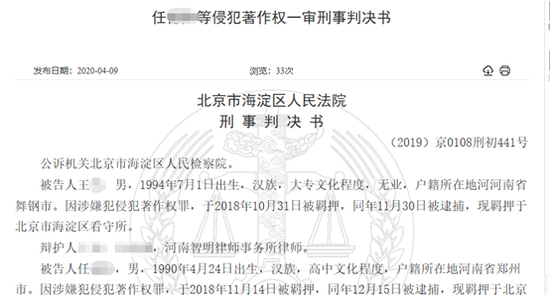 根据两份判决书显示,法院认定三人均已构成侵犯著作权罪。法院依法判处胡某某期徒刑4年,罚金30万元;分别判处王某、任某某有期徒刑3年6个月,罚金25万元。