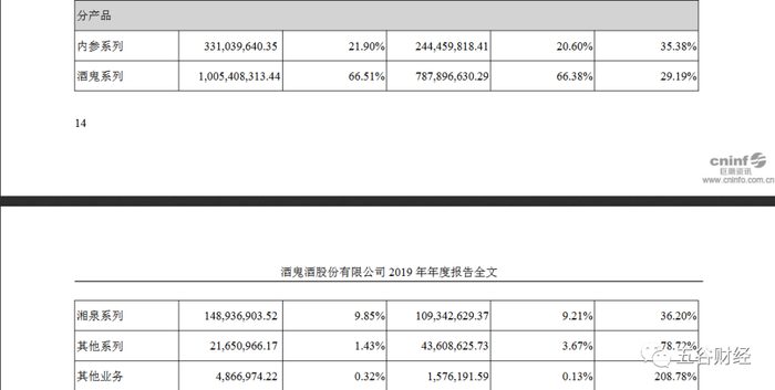 数据显示,在酒鬼酒2019年营业收入中,“内参酒”占比22%左右,“红坛酒鬼酒“占比15%左右,“传承酒鬼酒”占比9%左右。