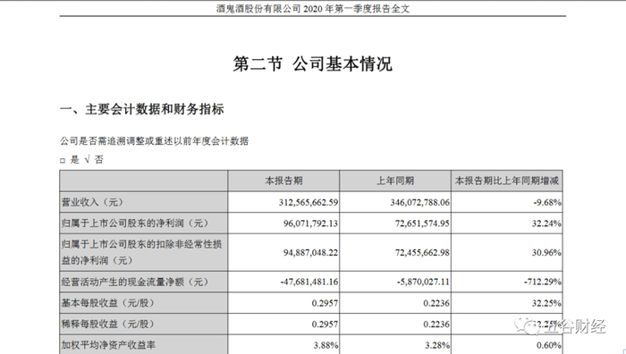 公告显示,2020年第一季度,酒鬼酒实现营业收入约为3.13亿元,与去年同期3.46亿元相比,降幅在10%左右;归属于上市公司股东的净利润约为0.96亿元,相较于2019年第一季度0.73亿元,增幅在32%左右。