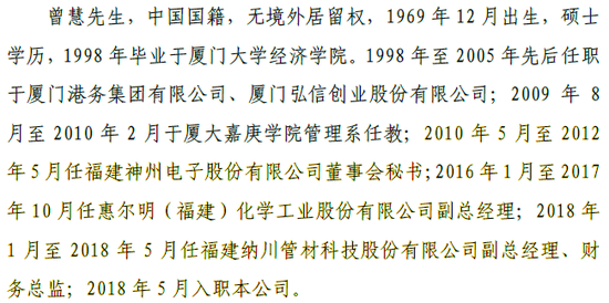 在简历中,曾慧于2016年1月至2017年10月任新三板公司惠尔明(福建)化学工业股份有限公司副总经理,但我们在惠尔明2016年年报中,并未找到有曾慧这么一位高级管理人员,难道副总经理不算高管吗?