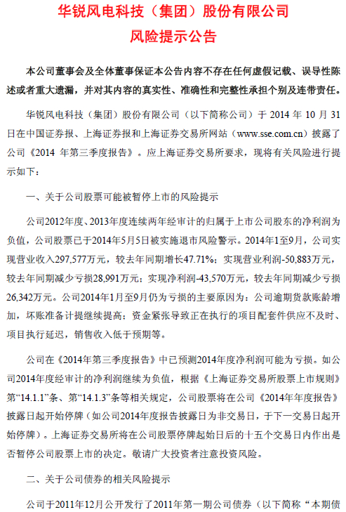 另一份是2014年10月31日发布的、关于对公司股票可能被暂停上市进行风险提示的公告,此时离中电电机上市还有4天。
