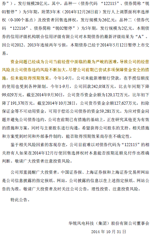 联合评级公司在评级报告中明确指出华锐风电存在“货币资金紧张、生产经营不稳定和债券到期偿付压力大等方面的诸多不利因素”。